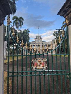 On our journey back to the hotel, we stopped at Iolani Palace. We weren't allowed in the fence, but it was fun to see from the outside. Across the street is the King Kamehameha statue and a little further down is a memorial to those lost in WW2. We finally got to feel a little Hawaiian rain on our walk to the bus.