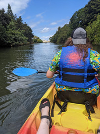 We started this day with some coffee from Brew + Foam. Then it was back on The Bus to the northside of the island. We checked in with Sea and Board Sports in Haleiwa to pick up our kayak. Turns out, kayaking in the ocean is neither easy or relaxing. The waves had us going all over the place and nowhere at all. After a ton of hassle, we made it to the river and it was easy sailing from there. We had the kayak for 3 hours which gave us ample time to go all the way down to the rocks and back twice. There were a few homes up and down the river, many with chickens and ducks that entertained us. We saw many sea turtles sunbathing on the side. I don’t recall ever seeing one in the wild before, so it was a treat to see these so closely.