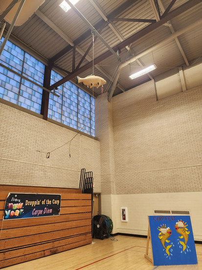 Today, "Carp Fest" is about a week long celebration held in Hoffman Hall. The carp drop seems to have changed: it is a blown up carp lowered in a gymnasium. The carp drop is around 5pm which is perfect for families and those driving distances. I haven't been able to find any sources that the frozen fish is still dropped, but would love to see it! But thank you to the Parks and Recreation team who keeps this version of the event running!